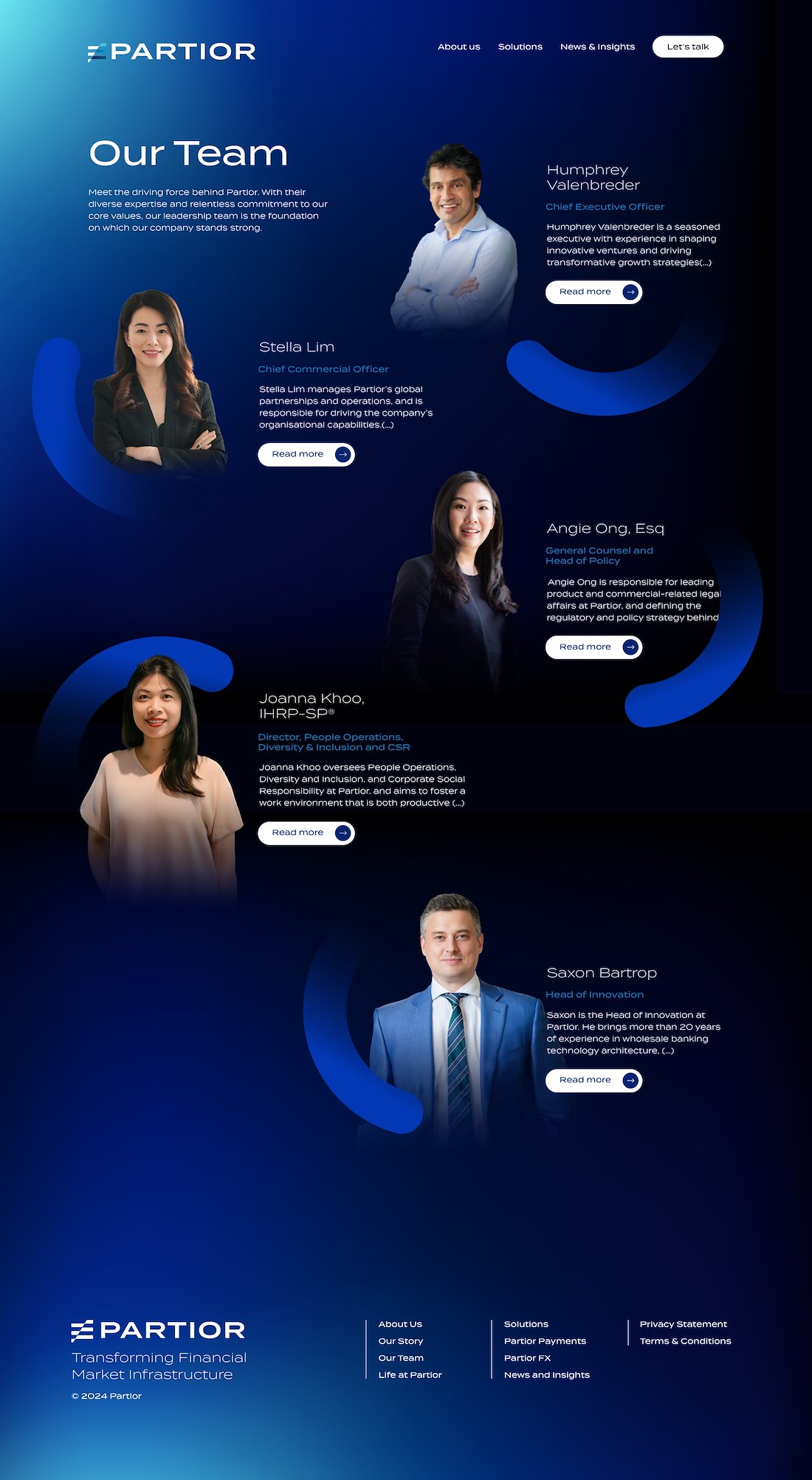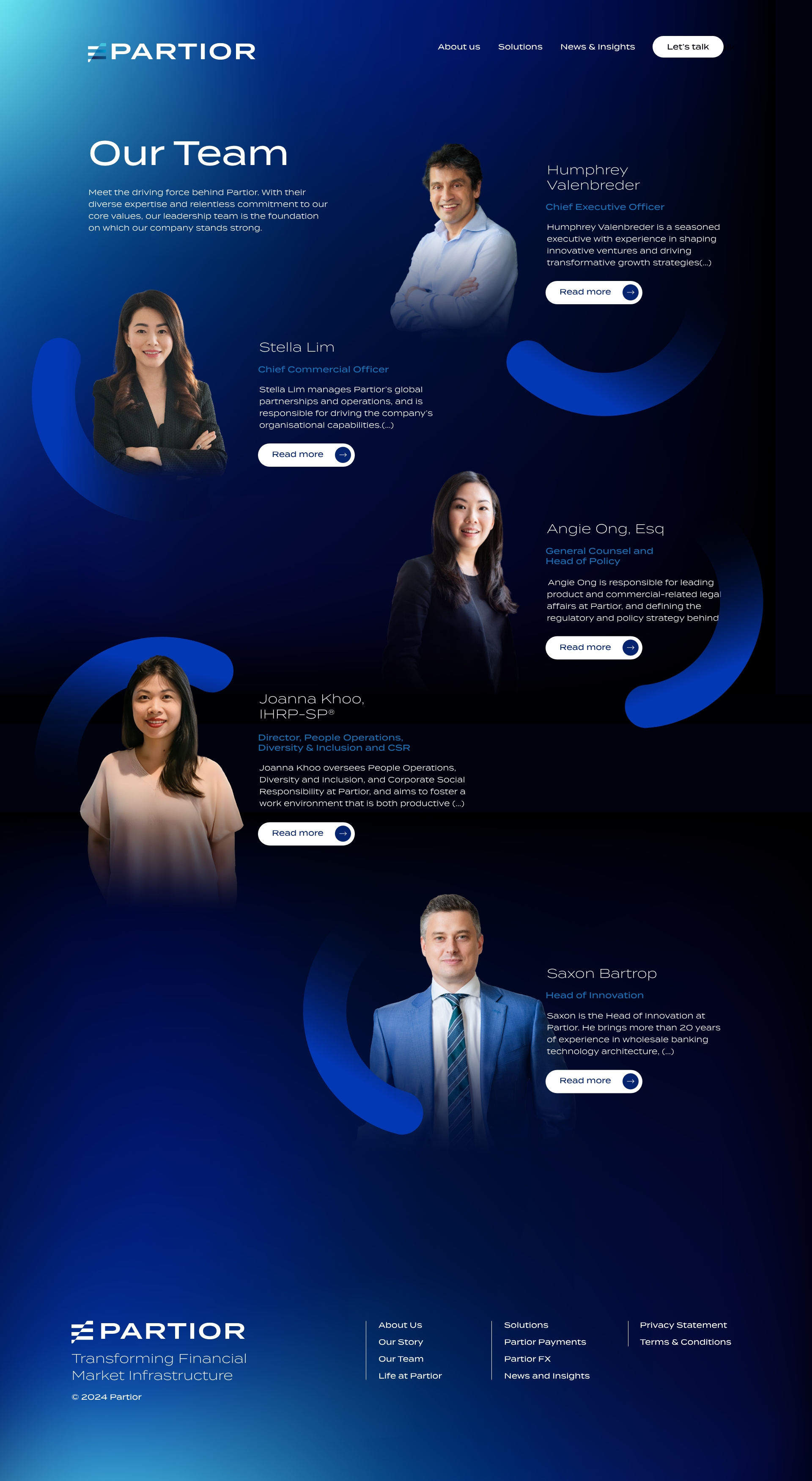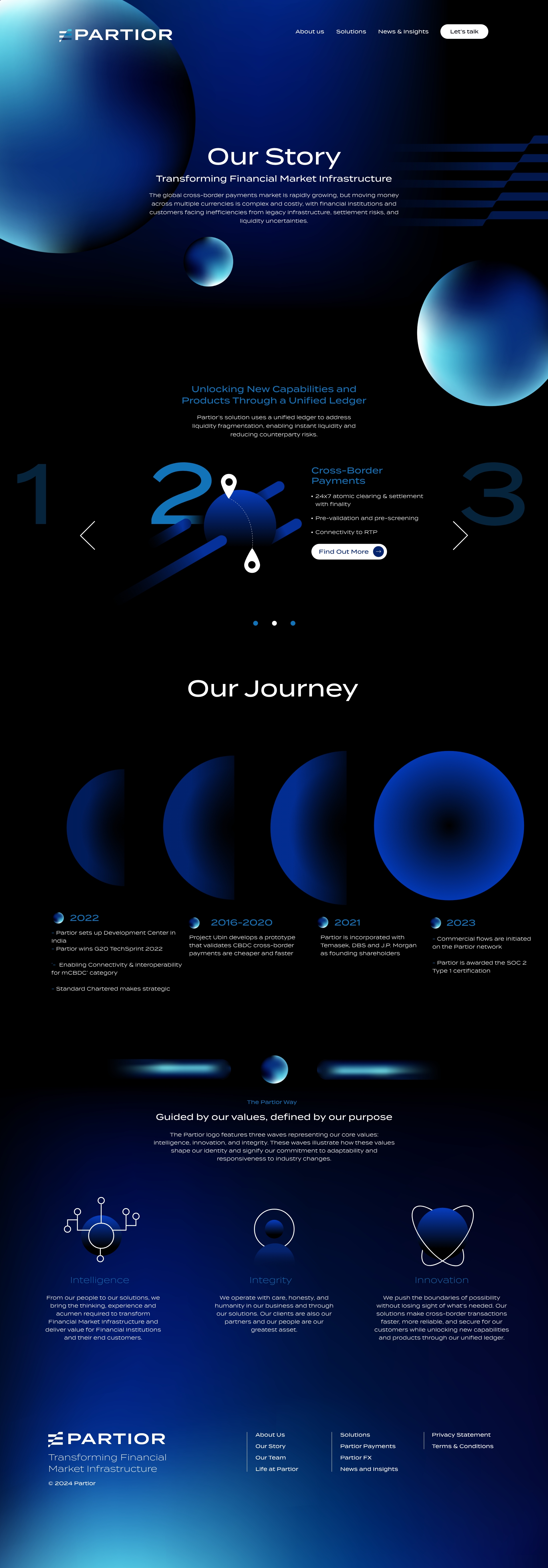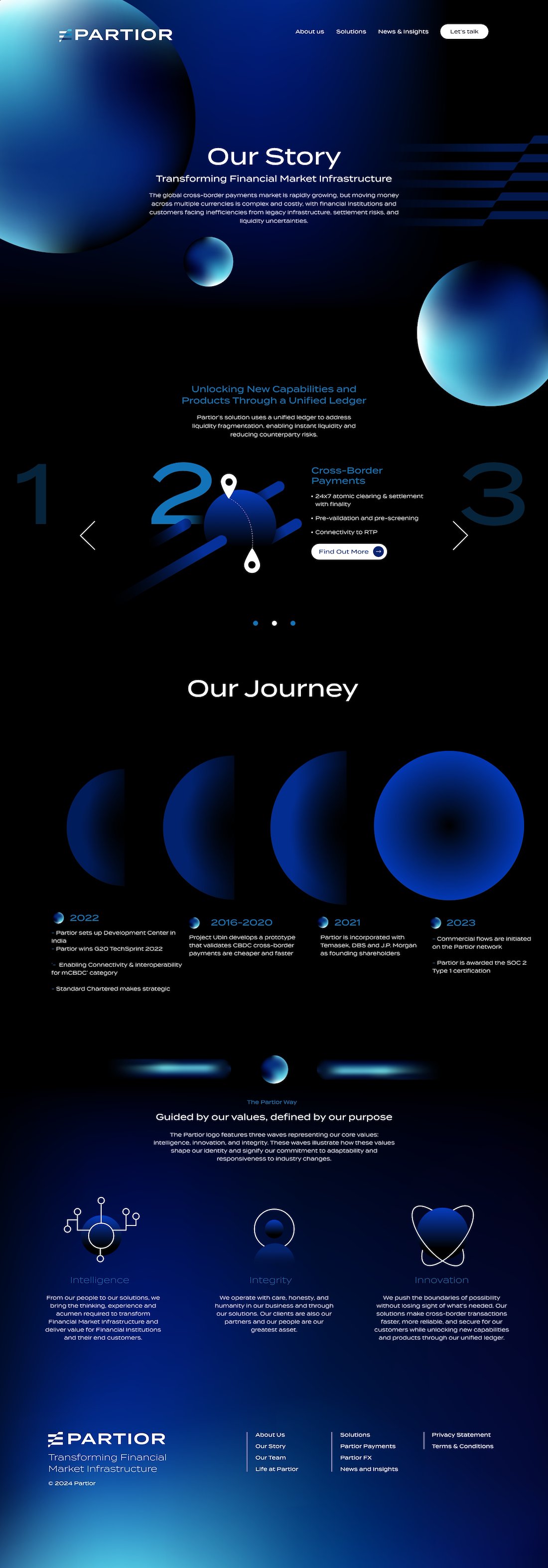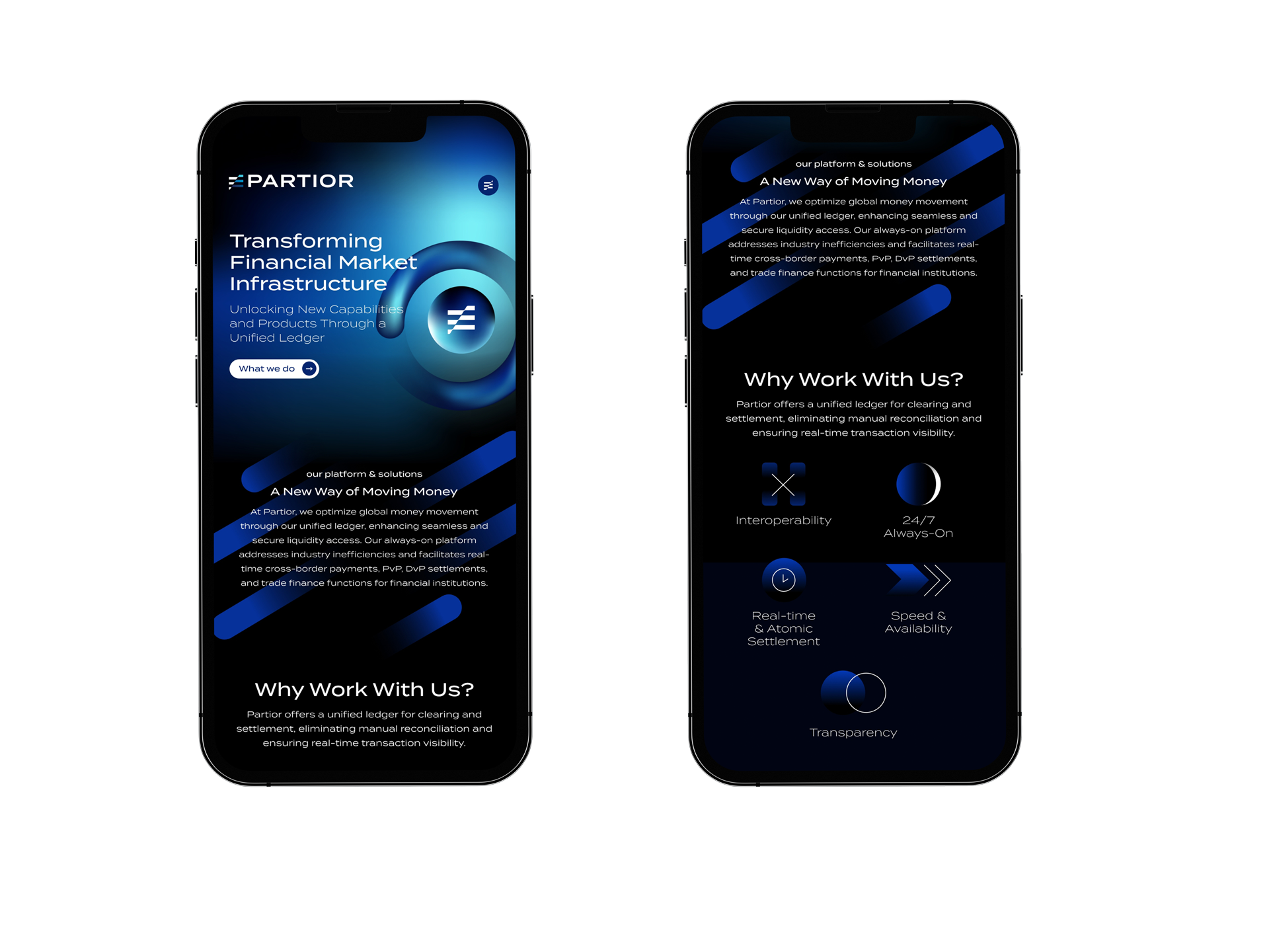 The Partior identity captures the core of its solution—a trusted global network for value exchanges. The graphic element introduces a sense of disruption, symbolising the market-changing impact of Partior’s technology. Its horizontal design evokes a sense of flow and direction, representing the movement of money across borders.The abstract visuals and colour palette are carefully crafted to reflect the brand’s premium, modern identity, embodying its core values. Blue, associated with trust, stability, control, and reliability, is used in varying shades to create a bold and distinctive presence in the market.