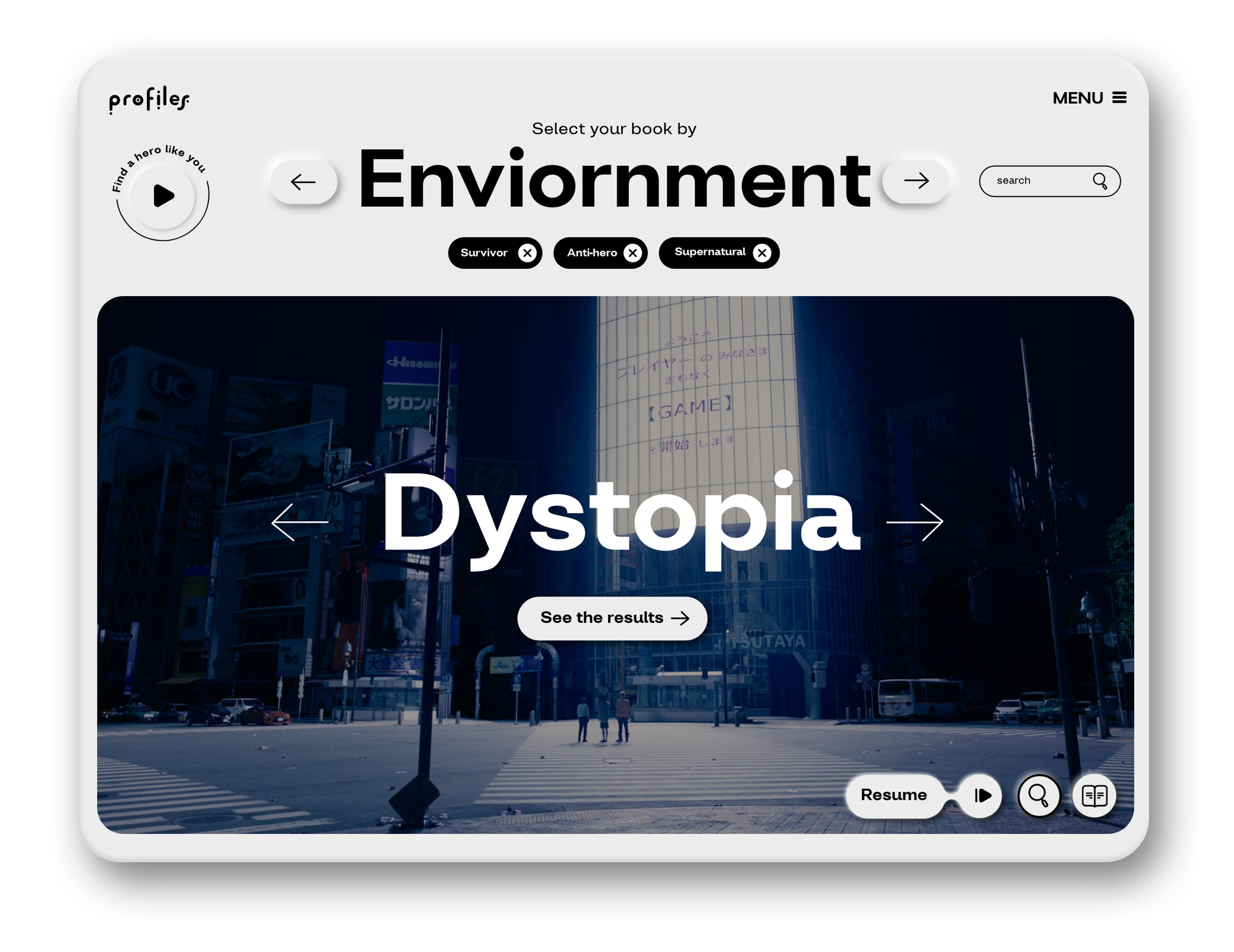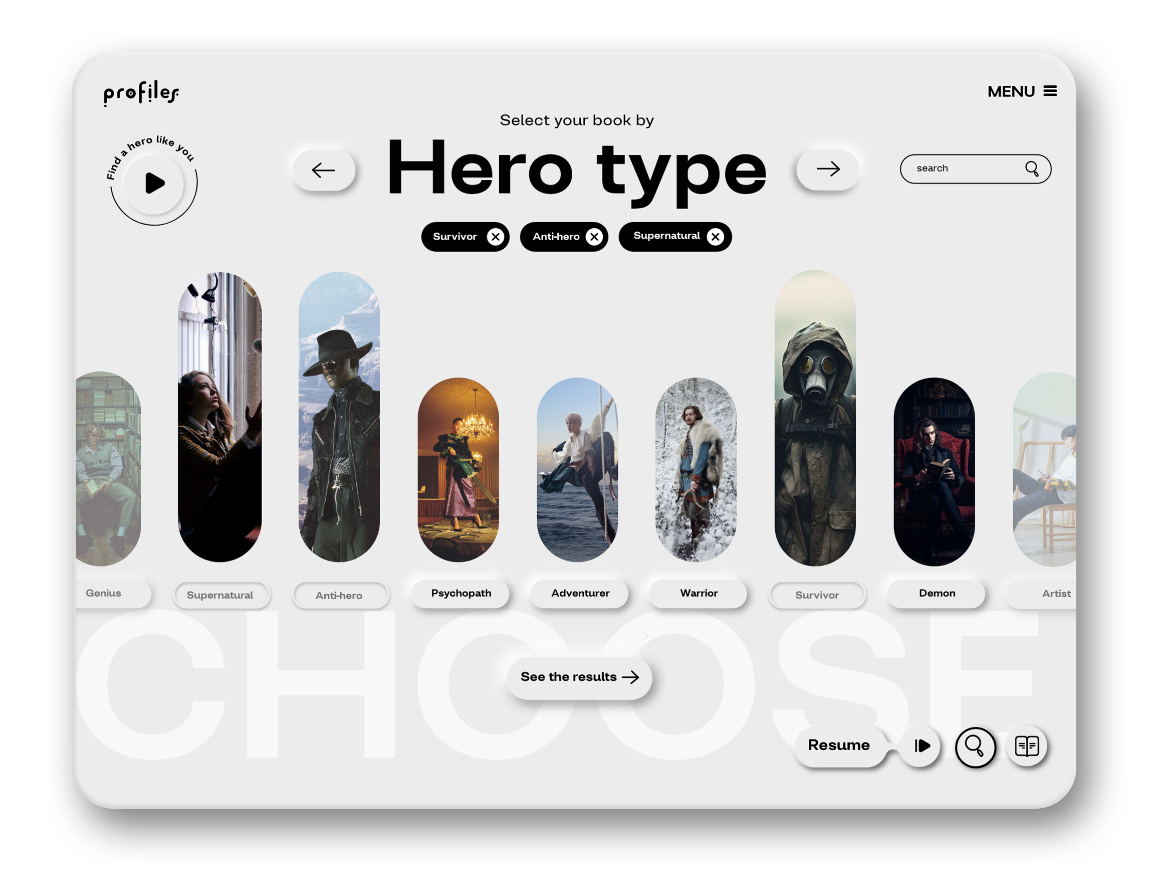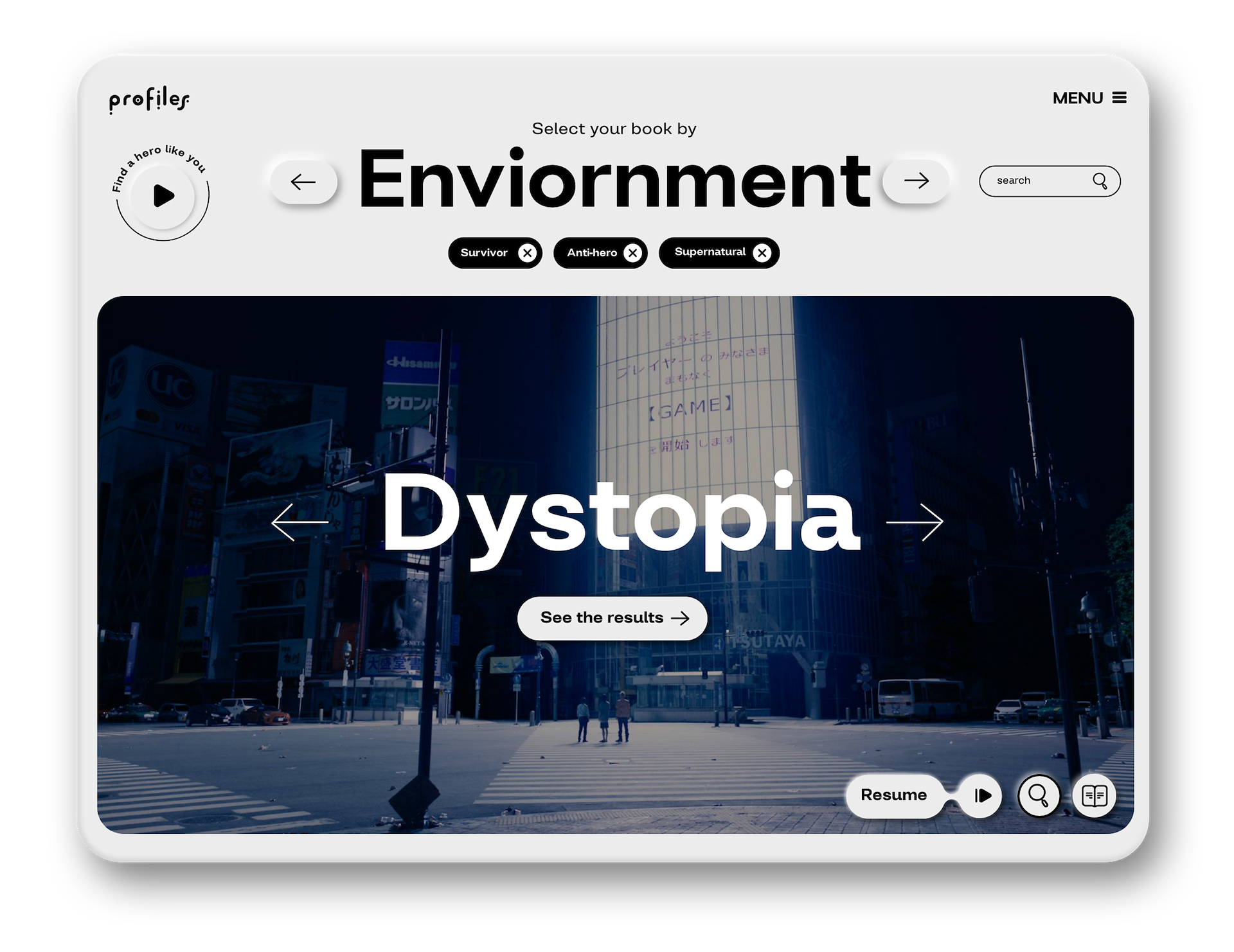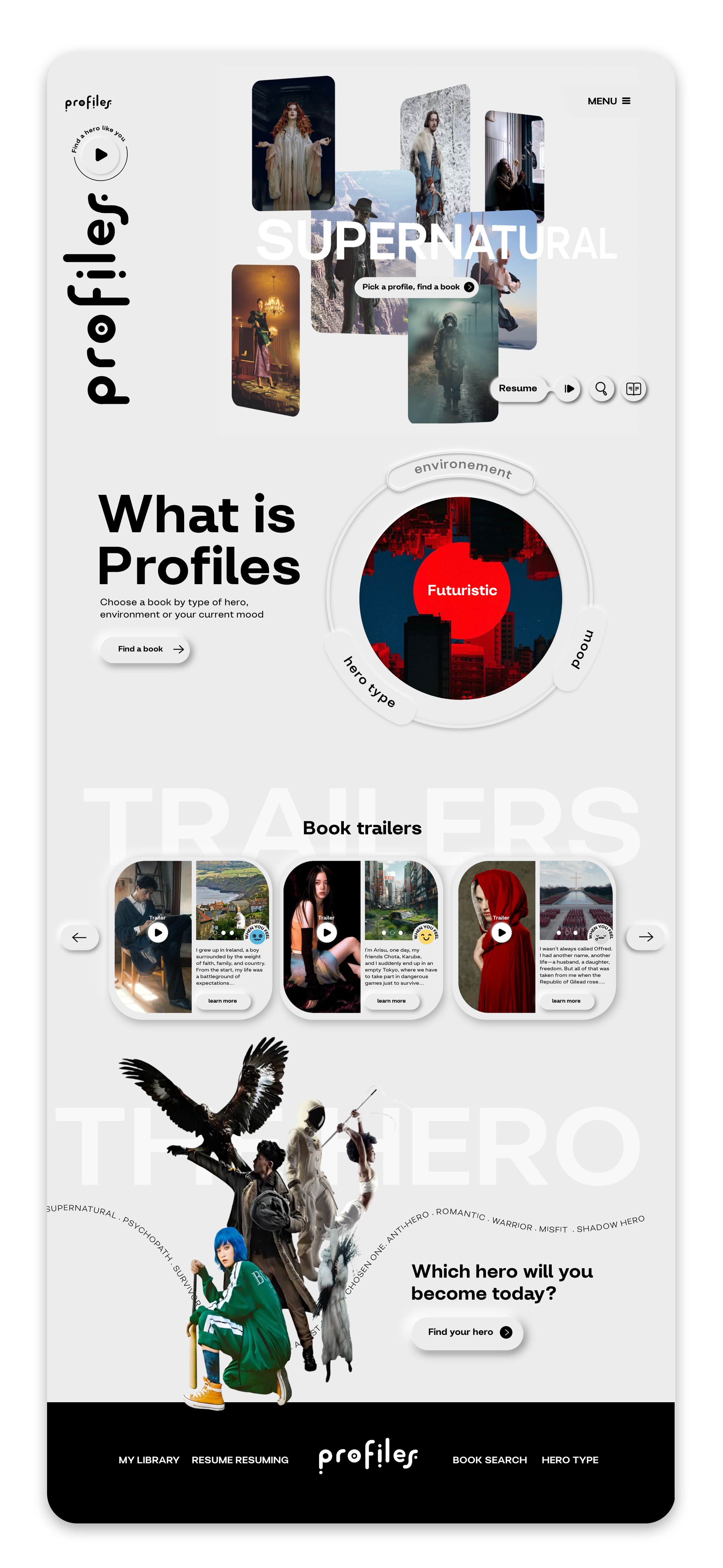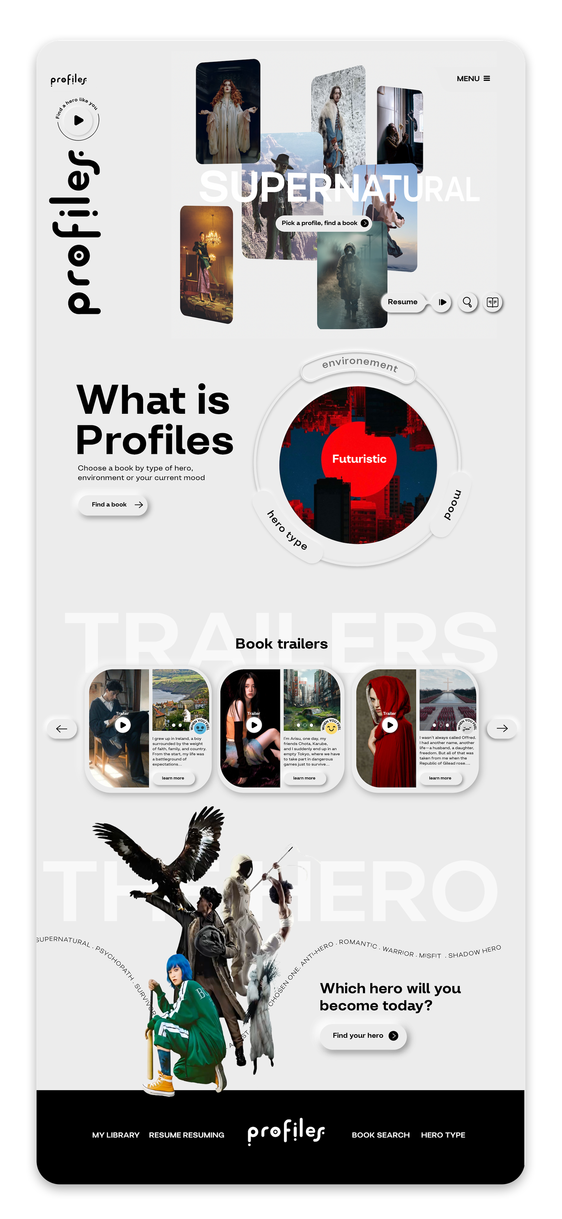 Profiles is an online library concept designed for teenagers who are not fond of reading. Each book in the library can be discovered through three different pathways: the hero type, the story’s environment, and the reader’s mood.