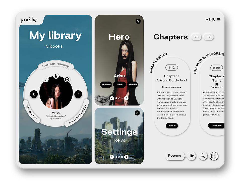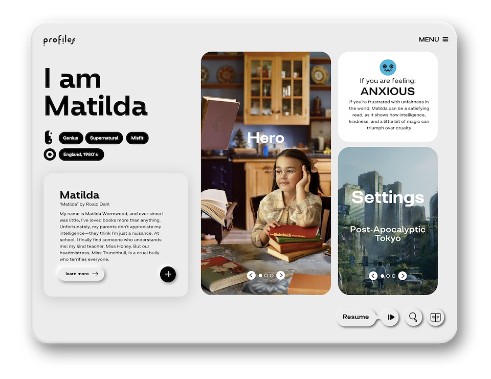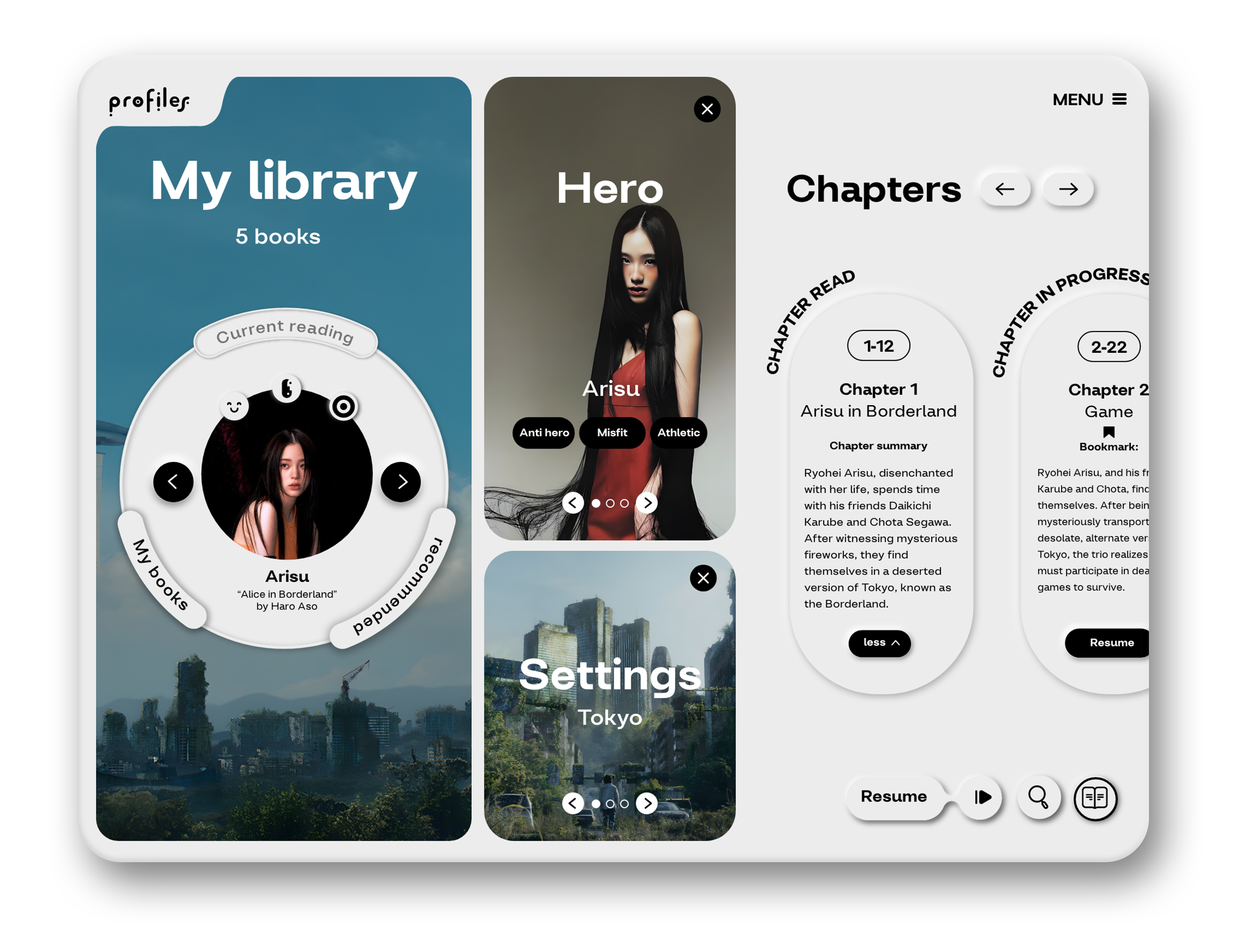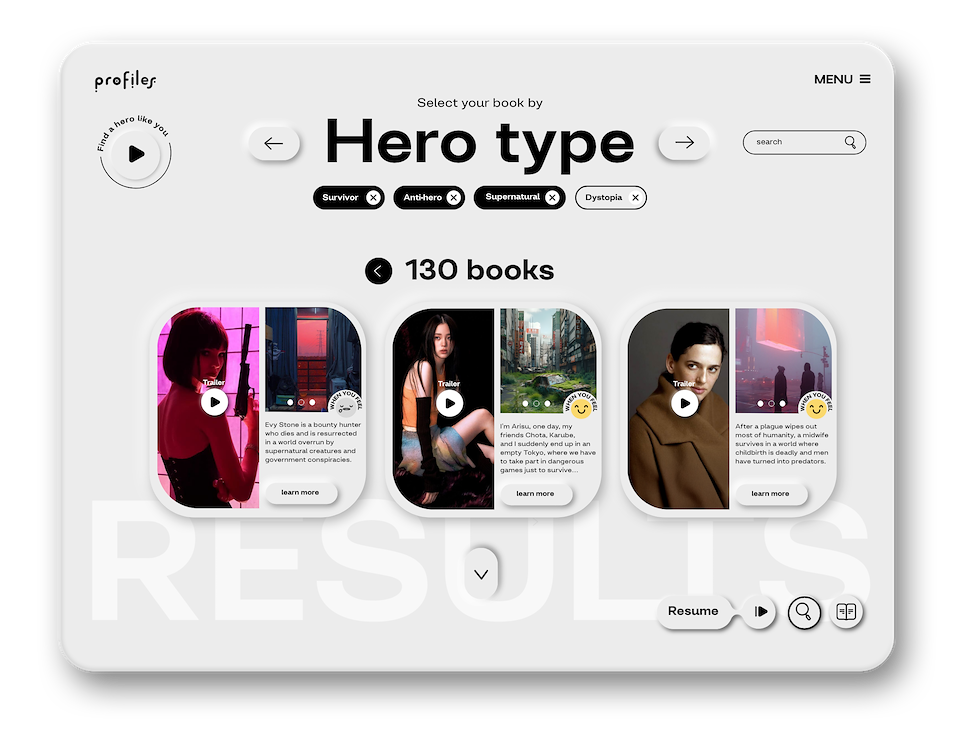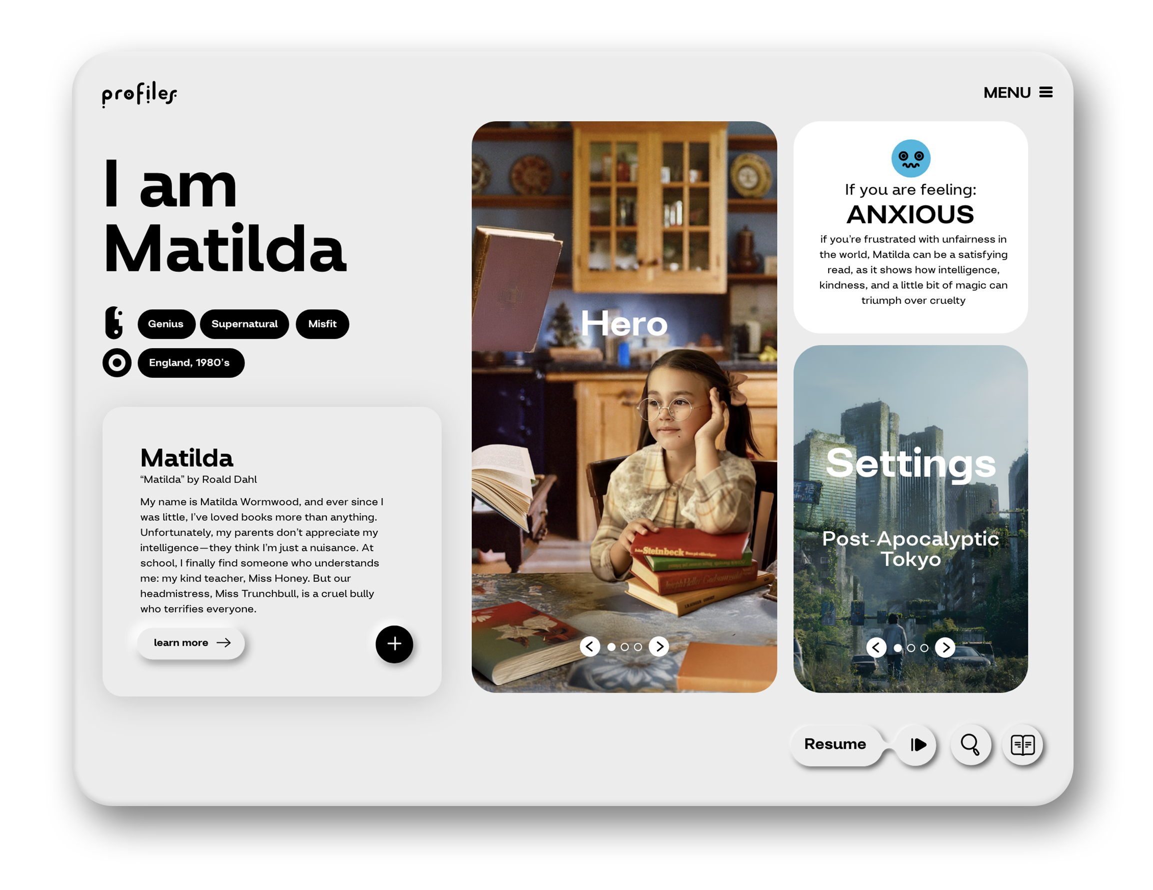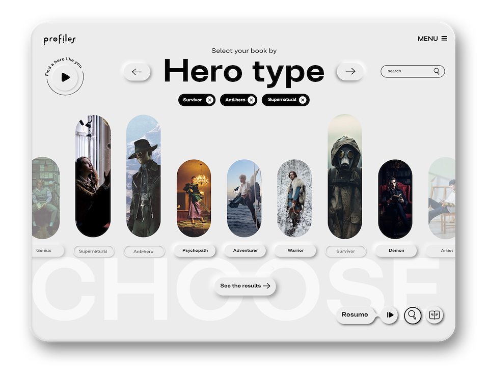 Profiles is an online library concept designed for teenagers who are not fond of reading. Each book in the library can be discovered through three different pathways: the hero type, the story’s environment, and the reader’s mood.